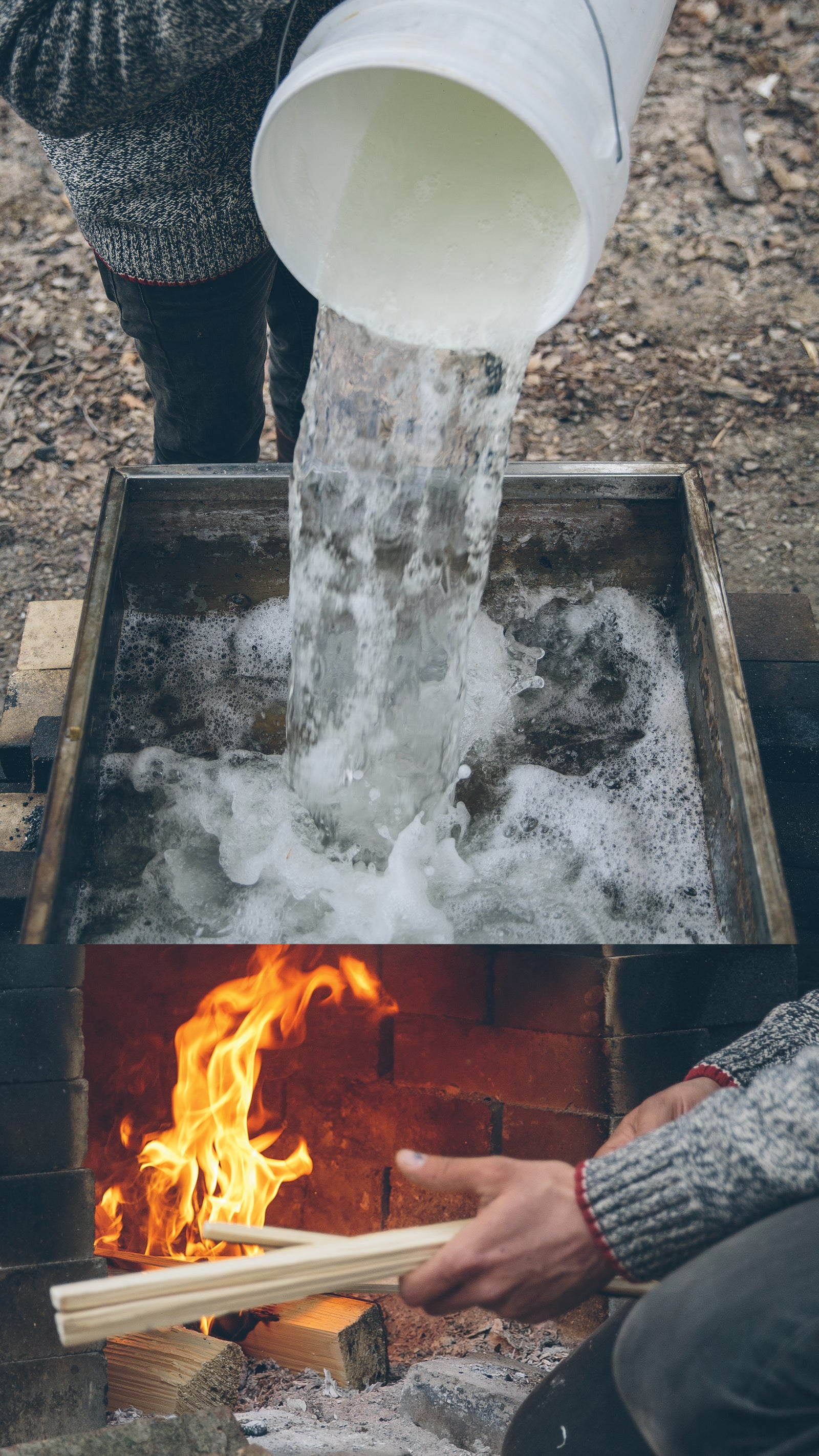 So it begins: the sap is in the pans and the fires are lit, now the magic starts. Maple syrup is made by concentrating the sap by reducing the water content. At Tapped Out, the reduction of water content is done solely by evaporation. There are other ways to reduce the content before the boiling begins, but we feel that can compromise the flavour. This is the grueling cycle of the syrup season (but we love it!). During the season, we are constantly collecting sap, adding it to the pans, splitting wood, keeping the fires burning and the sap boiling.