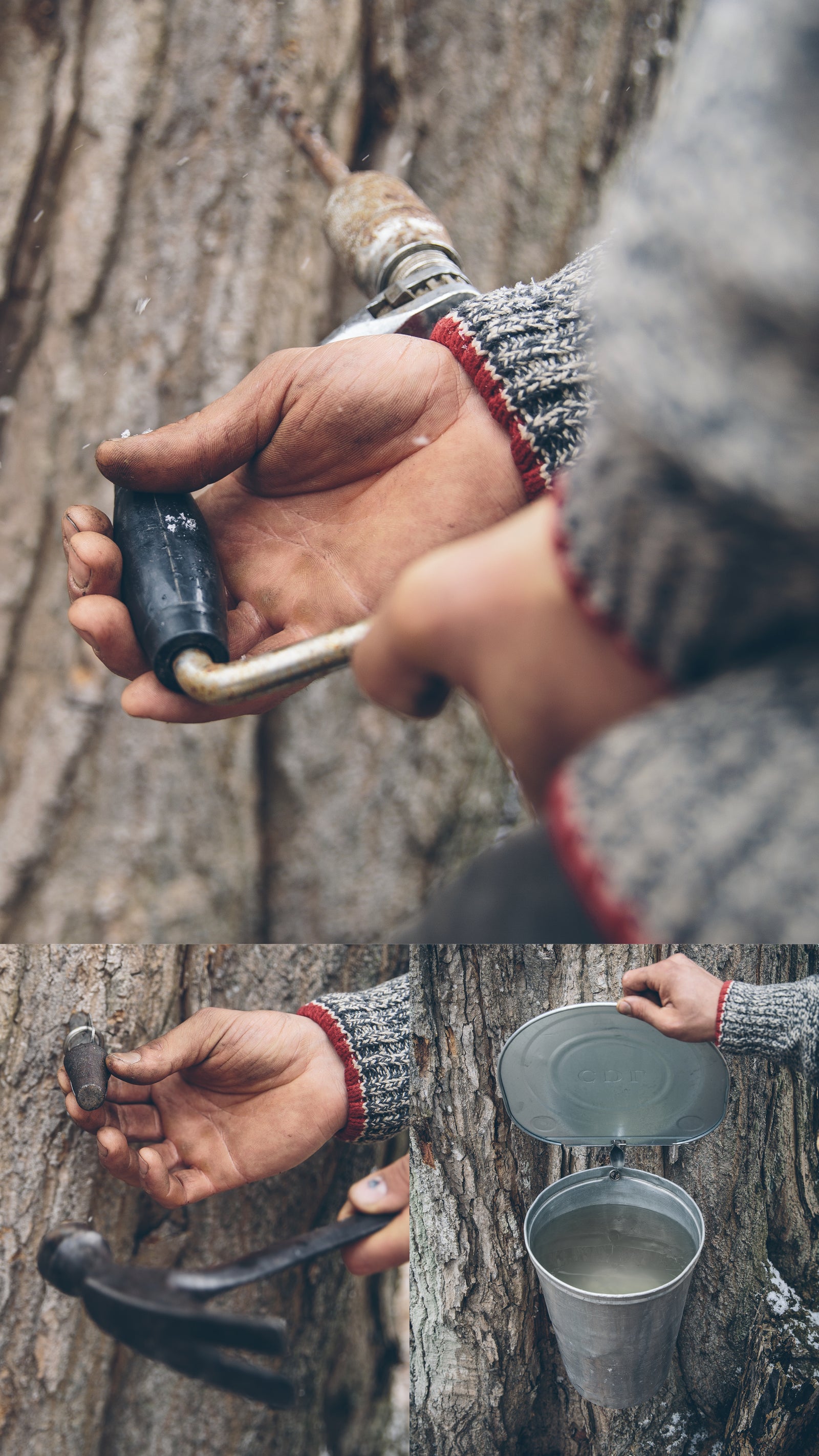 First, we ask permission. Then, we drill. I remember my mom telling me as we would walk around the forest tapping trees when I was young. The idea that these trees are living, growing beings - not just something we can take from without asking. I know it may seem like an odd concept - to ask a tree for something. It’s about learning to appreciate and respect the trees for the sap they provide us with. Without the maple trees, there would be no maple syrup!