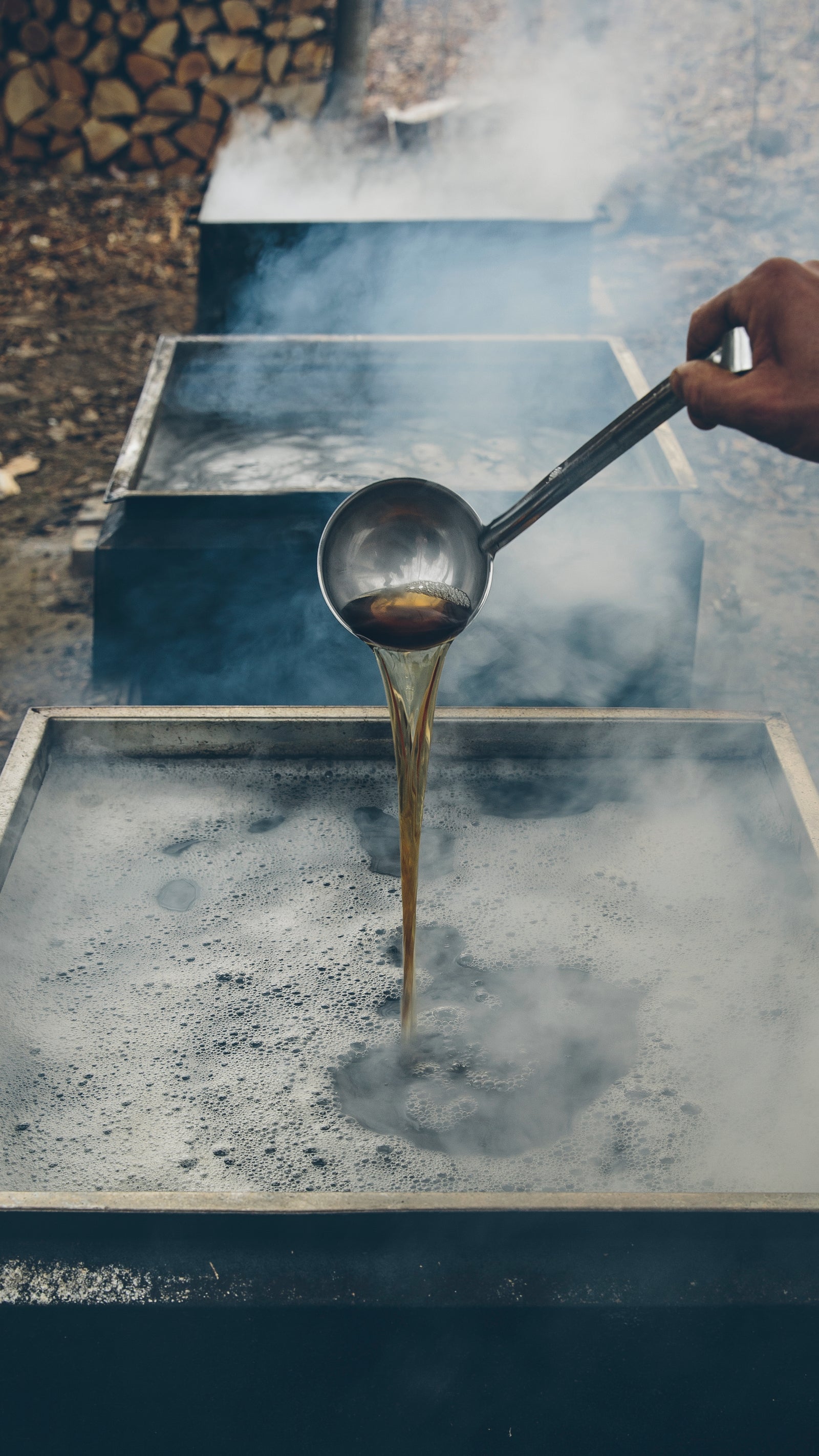At Tapped Out we cook our syrup in small batches. We add sap to the pans over the course of a few days, and then when the time seems right, we stop and start the final cook down. The timing is never the same, and usually dictated by mother nature through the ebbs and flows of the sap. Most batches average only around 20 litres of maple syrup, which contains almost 900 litres of sap that was evaporated. The sap to syrup ratio is 40:1, but at Tapped Out, we bring our syrup to a much higher sugar content - this results in a much higher sap to syrup ratio, and more flavourful syrup.