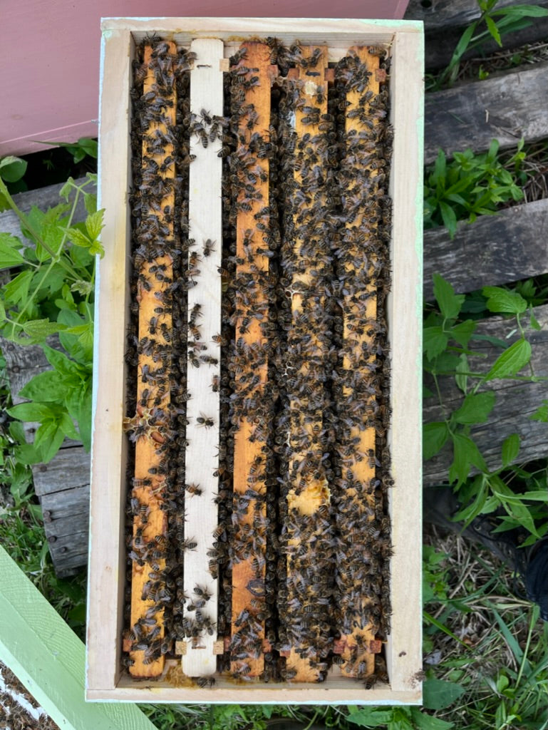 Our deep Nucs are 4 frame. They come with 1 frame of food (honey & pollen), two frames of brood, some open some capped, and a drawn frame for the queen to have space to lay. All frames will be fully covered with bees. The queen will always be the accepted queen from the hive, however she will be caged. We do this to ensure she does not get damaged in the Nuc during transport or while you are installing the Nuc. Once you install the Nuc you can release her from the cage or simply install it like you are introducing the queen and they will release her once they eat the candy away.