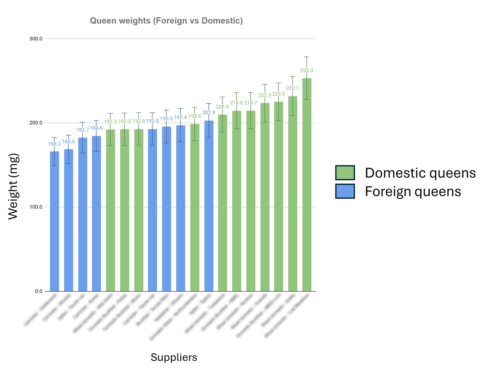 Our queens are represented by the furthest right green bar. Because this research was done without the consent of the other breeders to release their data the names are blurred on the bottom.